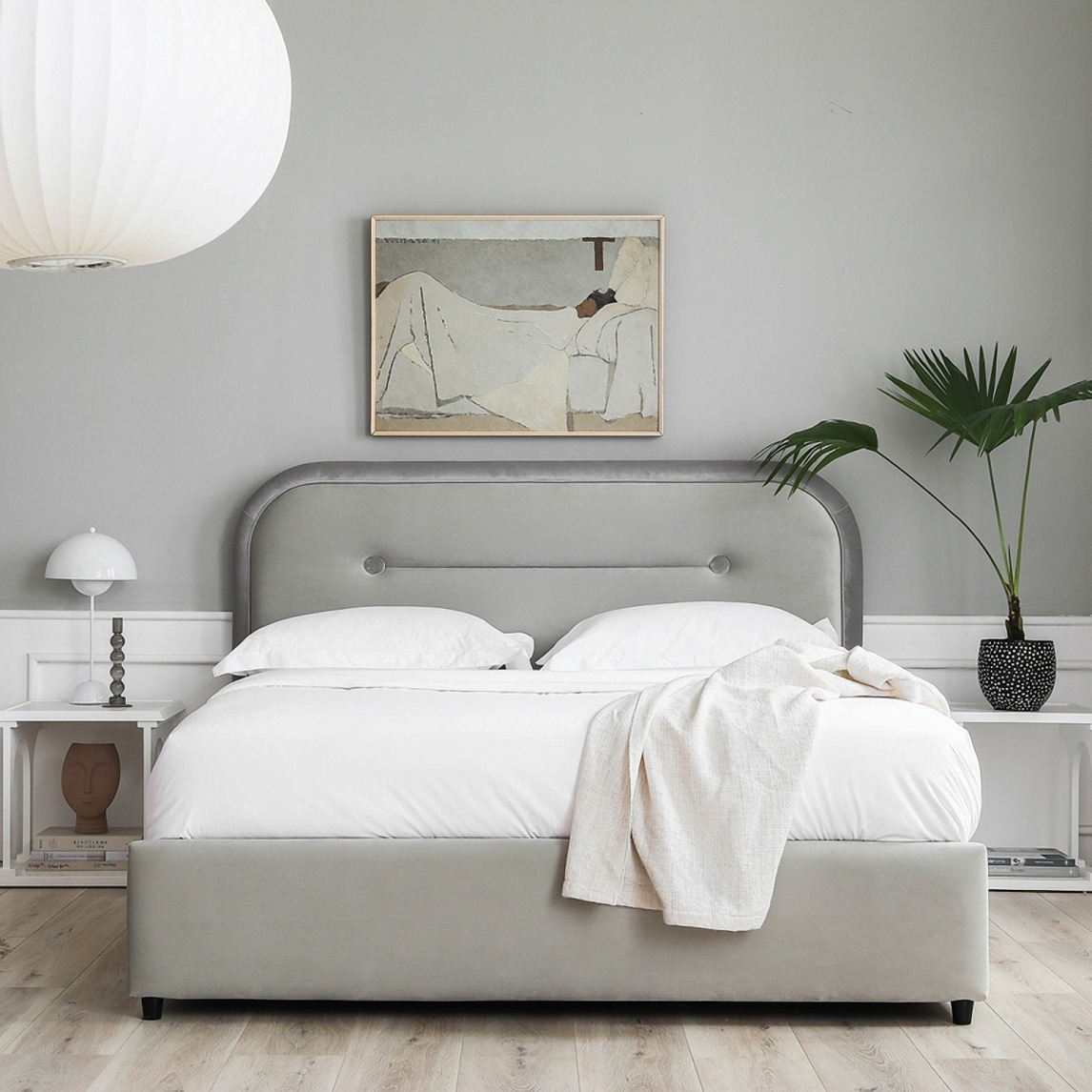 整体空间是简约的格调,[InYard宜氧]品牌大白造型的丝绒床给你暖男般守护的体验,简欧风古堡边几搭配丹麦设计tradition现代风台灯,打造精致主义的卧室美学。
