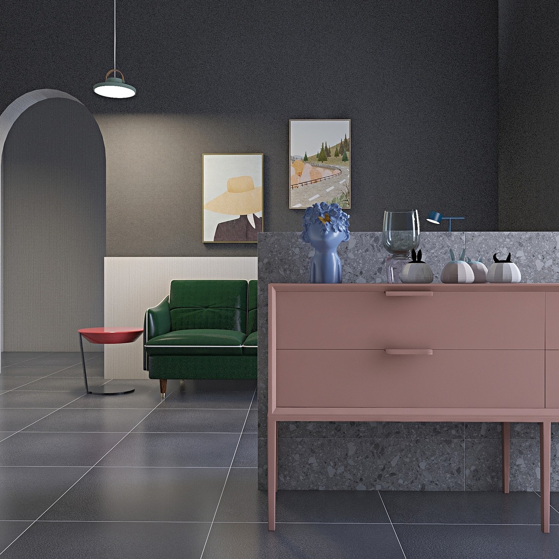 玄关设计 半高空间玄关设计符合设计需要 体现空间优势 绿色沙发与红色边几 整体色彩搭配时尚年轻 灰色与水磨石的合理运用