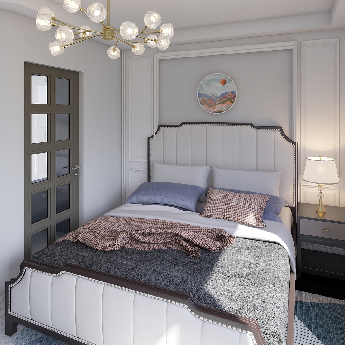 灰白经典搭配,耐看不过时,点缀装饰画及明快色调的床上用品为卧室增添了不少气氛,安静地窝在属于自己的小窝里,享受着生活的舒适。