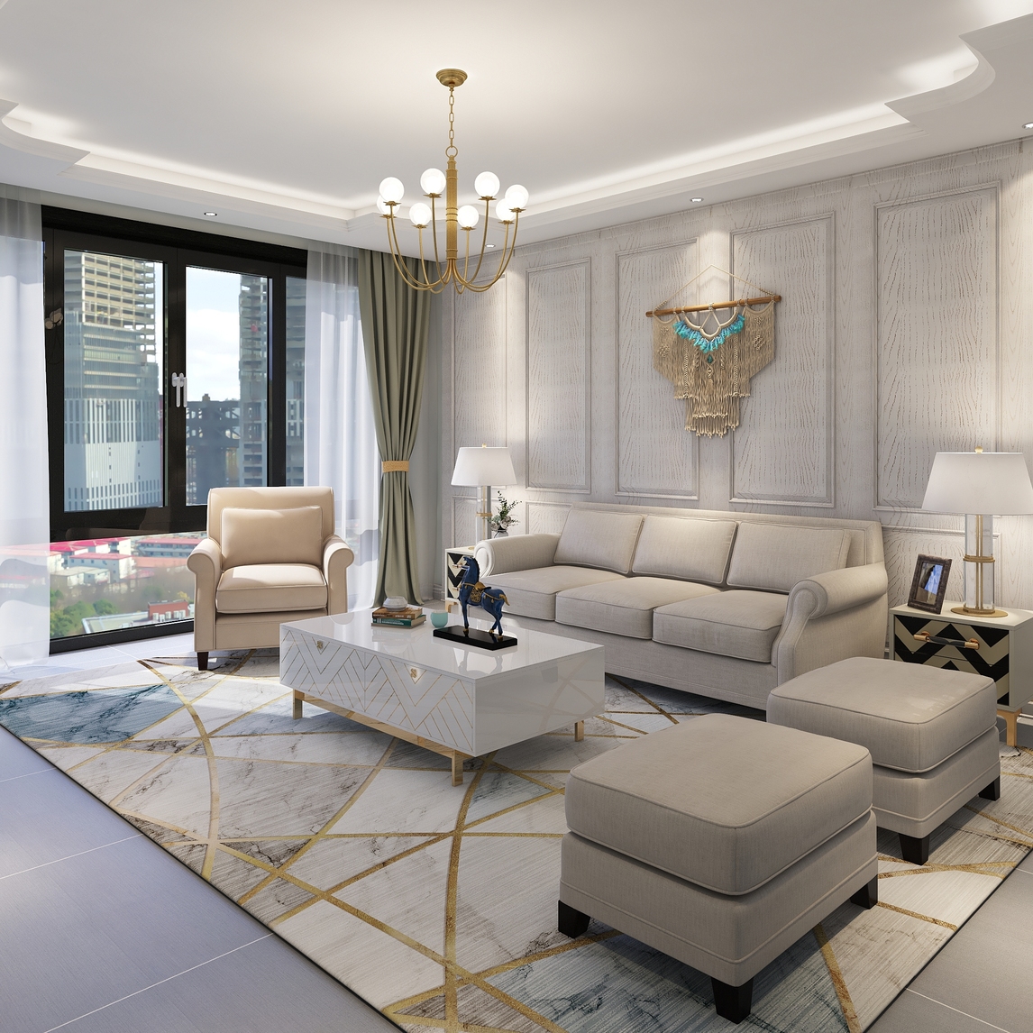 简美偏爱自然、怀旧,而轻奢重在精致。我将两者混搭起来,营造一个温馨舒适的会客空间。白色木纹护墙板、米色布艺沙发,绿灰色布艺窗帘,搭配轻奢黄铜质感的灯具,整体奢华大气,却不失温馨、自然的居家情调。