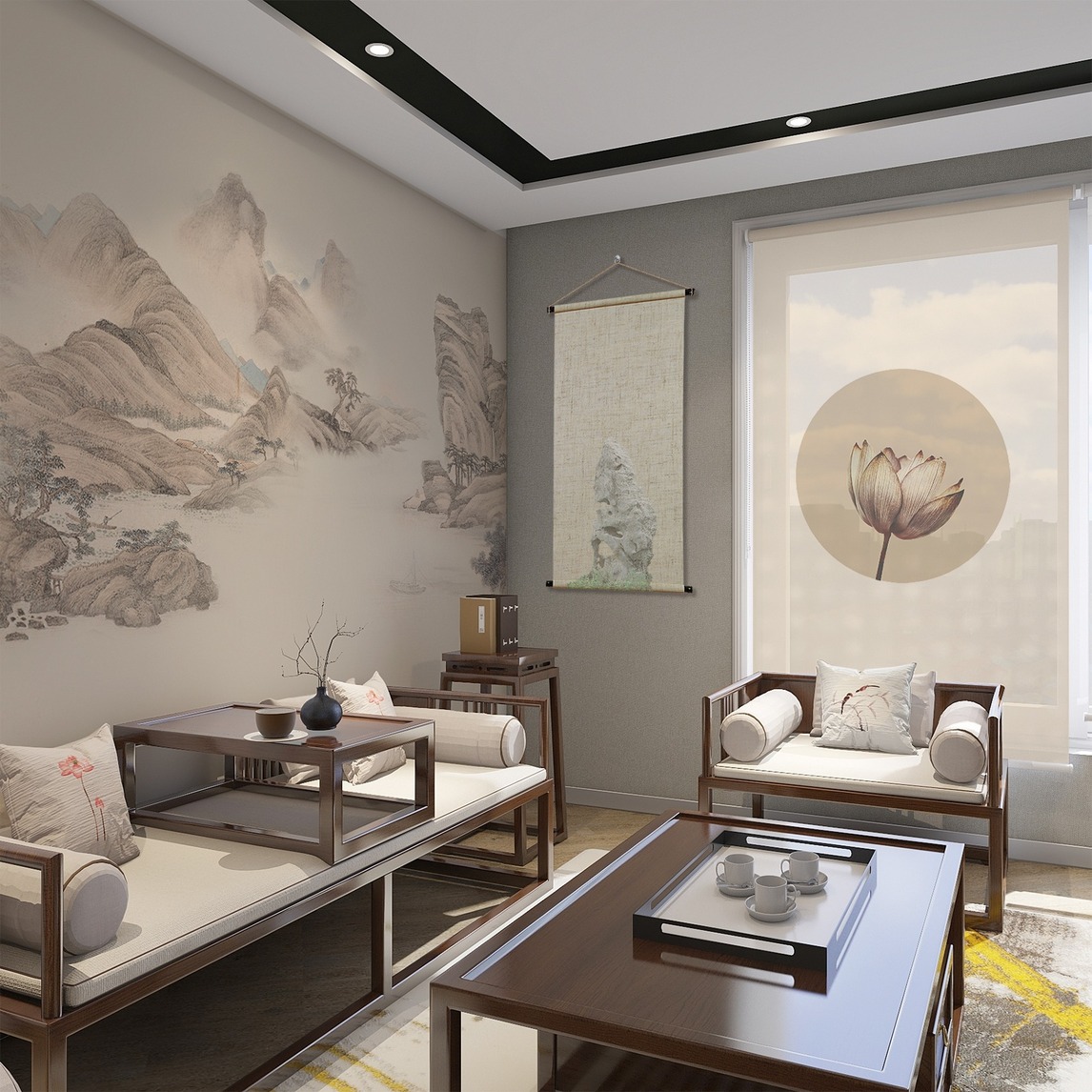 新中式客厅有着中式风的古典美,从窗户到挂画、墙壁的装饰壁纸都选择了中式元素的图案,桌椅也选择了素雅的实木家具,空间在充满中式韵味的同时,也兼具禅意之感。