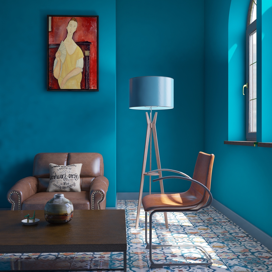 自带忧郁的蓝色和复古花砖的搭配仿佛让人一下穿越了时空,皮质的椅子和沙发自带的年代感沧桑深邃,异域美感。