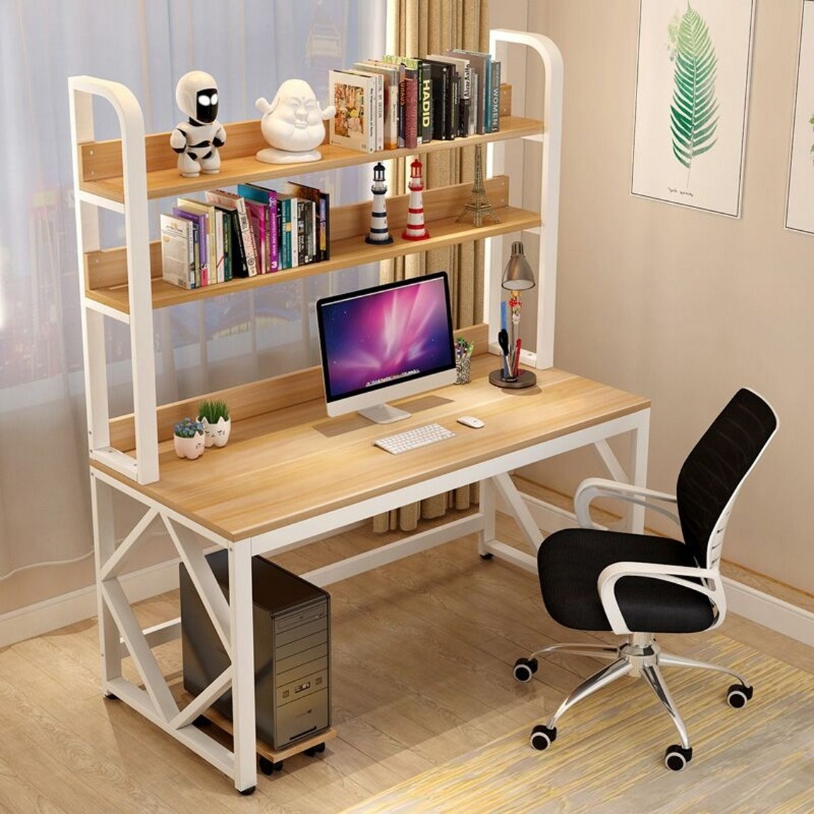 铁艺的框架主体,符合的实木桌面,整体结实稳固,属于经济型的书架书桌,满足你的日常使用需求,学习办公都可以。