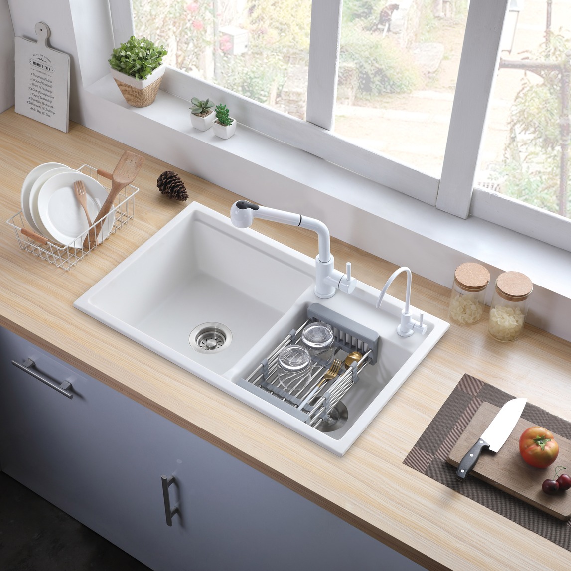 改槽换代,改变对洗菜盆过去冰冷的不锈钢色,白色石英石水槽更显温柔和暖意。除此之外,别致新颖的抽拉龙头,设计感满满,让你打扫更方便,360度无死角清洗