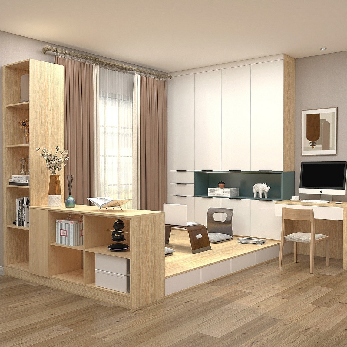 在榻榻米的床尾装一个L型书柜,结合它有序的实木多层隔板,极具环保实用性,收纳强大的它显得卧室整体更加美观。 衣柜与书柜夹着一张榻榻米床,是集休闲与睡眠一体的最佳空间,特别适合小户型。