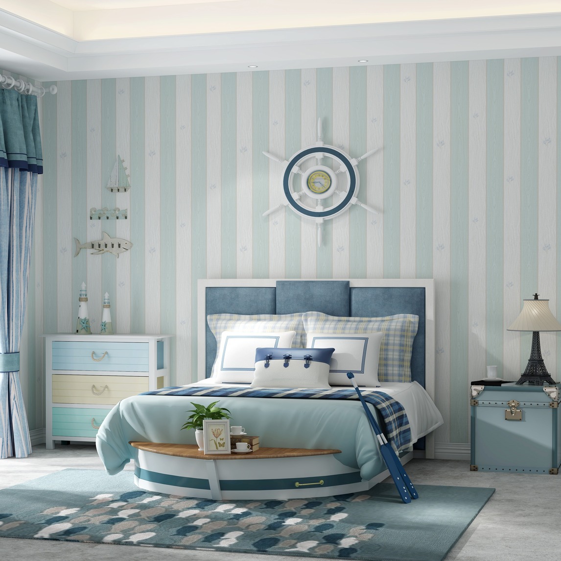 浅浅的蓝色非常柔和而又安静,墙纸条纹的设计让空间层次感更强,在疲惫的傍晚归于家中,躺在舒适的床上,整个人都被治愈了。