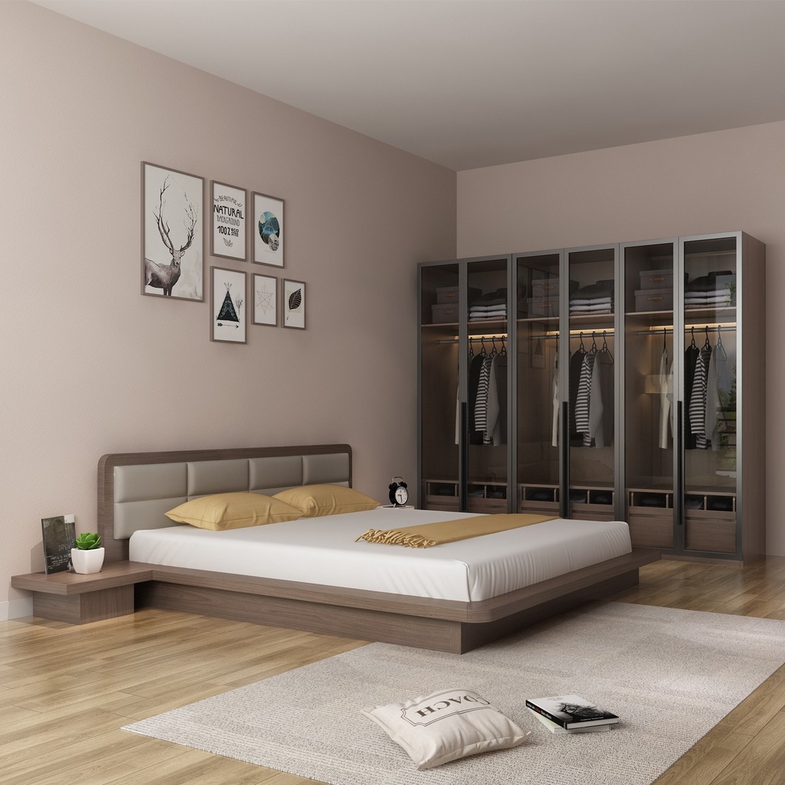 日式风格,朴素 典雅 根据现在都市需求设计,特点矮,小朋友也可以自己轻松上下床,卧室有一款红外感应灯钢化玻璃衣柜,开门即亮,关门自动熄灯,科技感十足。