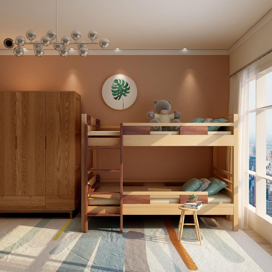 双层床搭配衣柜的组合,给儿童房带来舒适的环境的同时,也不失他的使用行,白橡木的双层床,非常的结实耐用,上下两层超高的护栏,在儿童睡眠的时候也有着很不错的保护作用,实木的三门衣柜,有着超大的储物空间,孩...展开