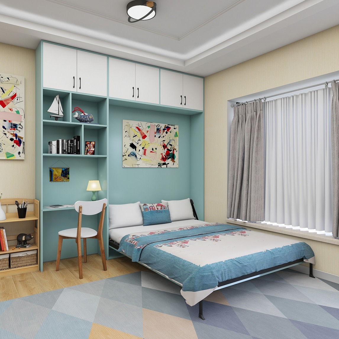 简单简约又不失实用的儿童房,完全定制的储物柜和顶柜组合,可以装下孩子成长与学习经历的一切,不管是书籍,玩具还是衣服,统统不在话下。折叠式隐形床白天可以收起来,给孩子天马行空的想象力腾出空间;拥有气撑助...展开