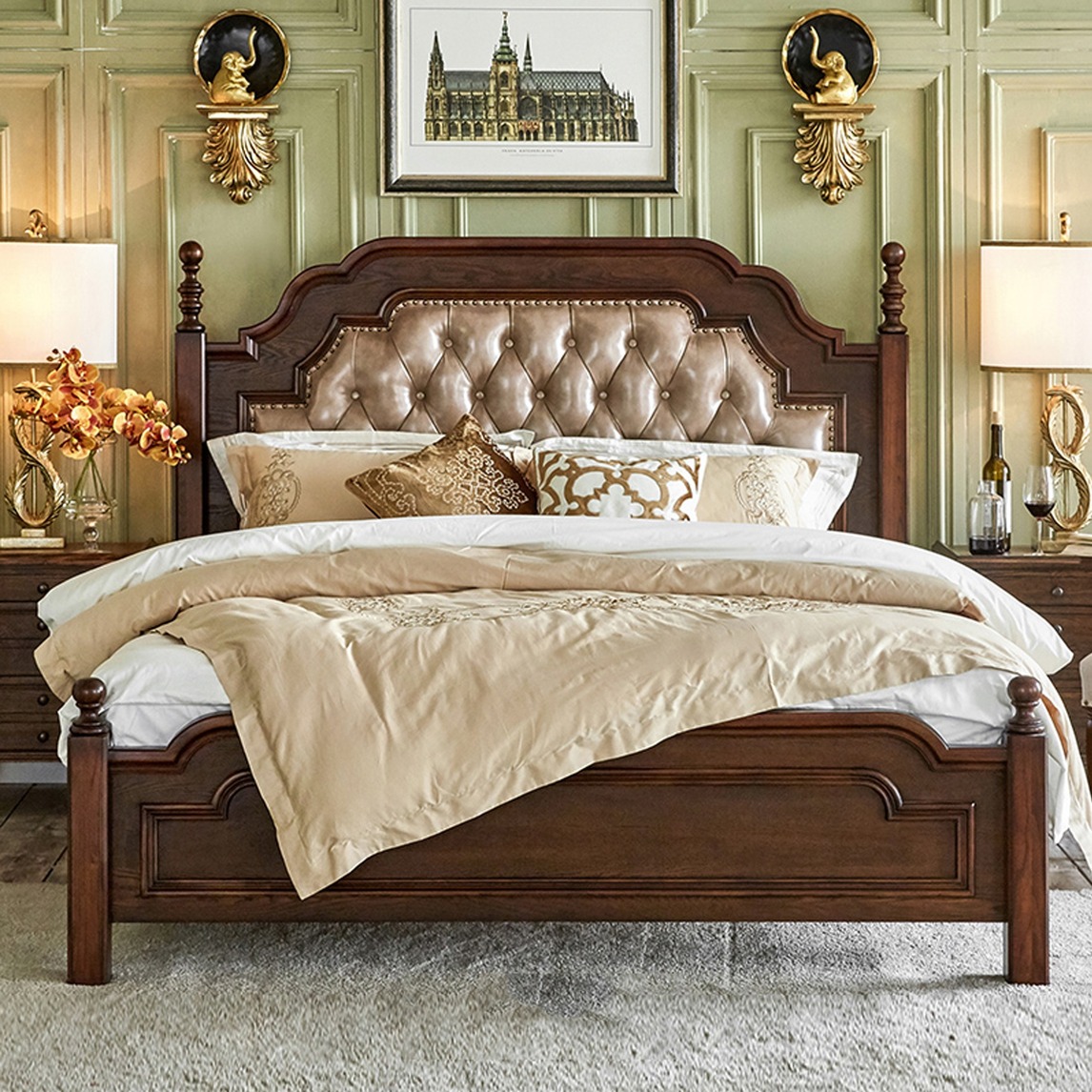 这是一款美式乡村真皮床,它的床头带着强烈的装饰主义色彩,既有新古典主义建筑中恢弘的立柱元素,又融入装饰主义风格层层缩进的线条。只需要点缀简单的挂画和灯饰,就十分出挑。
