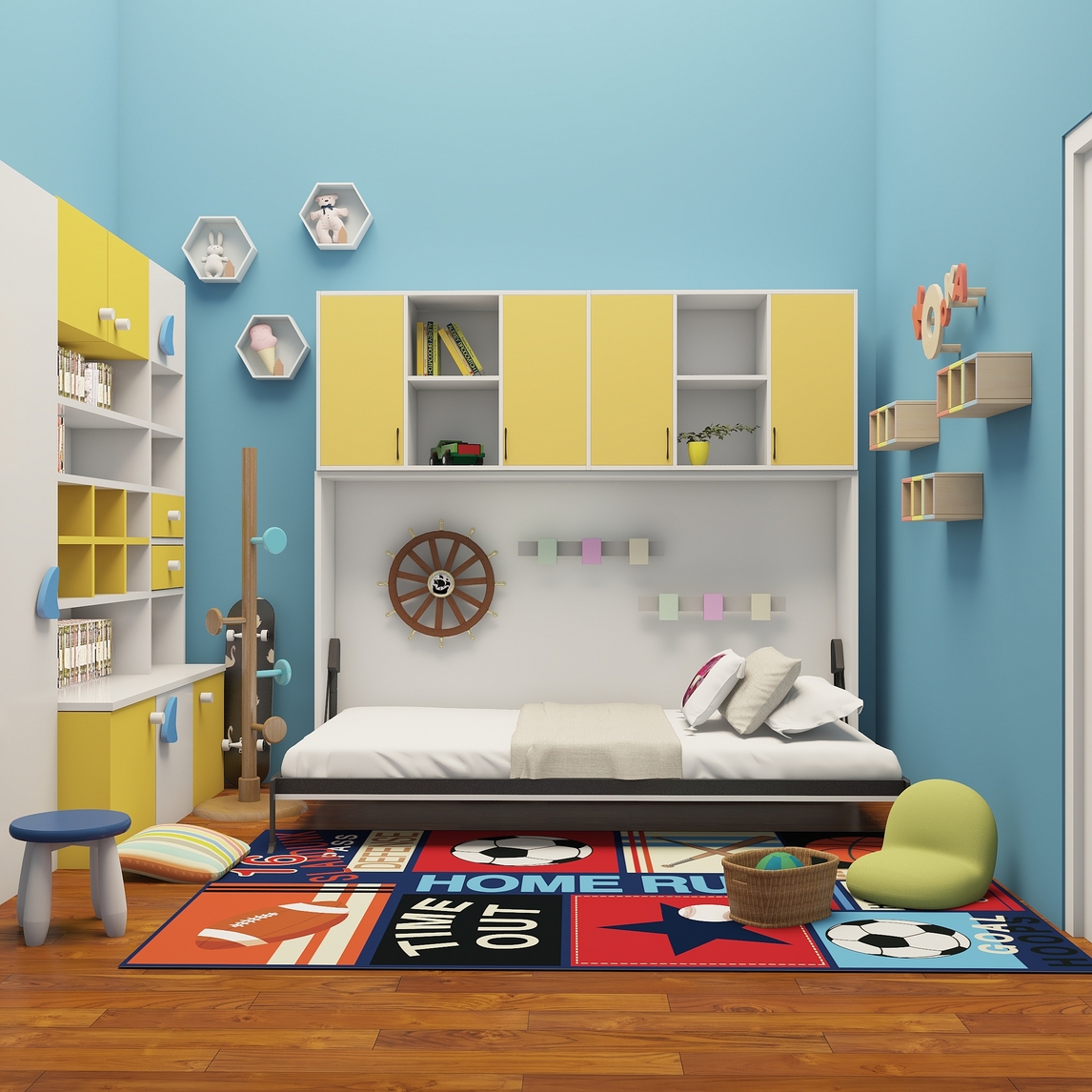 孩童的世界既是纯粹的,蓝色的墙面配上白色的柜体简单纯粹,黄色的加入给房间更增添了一抹颜色,充满童趣的搭配给孩子一个快乐的童年!