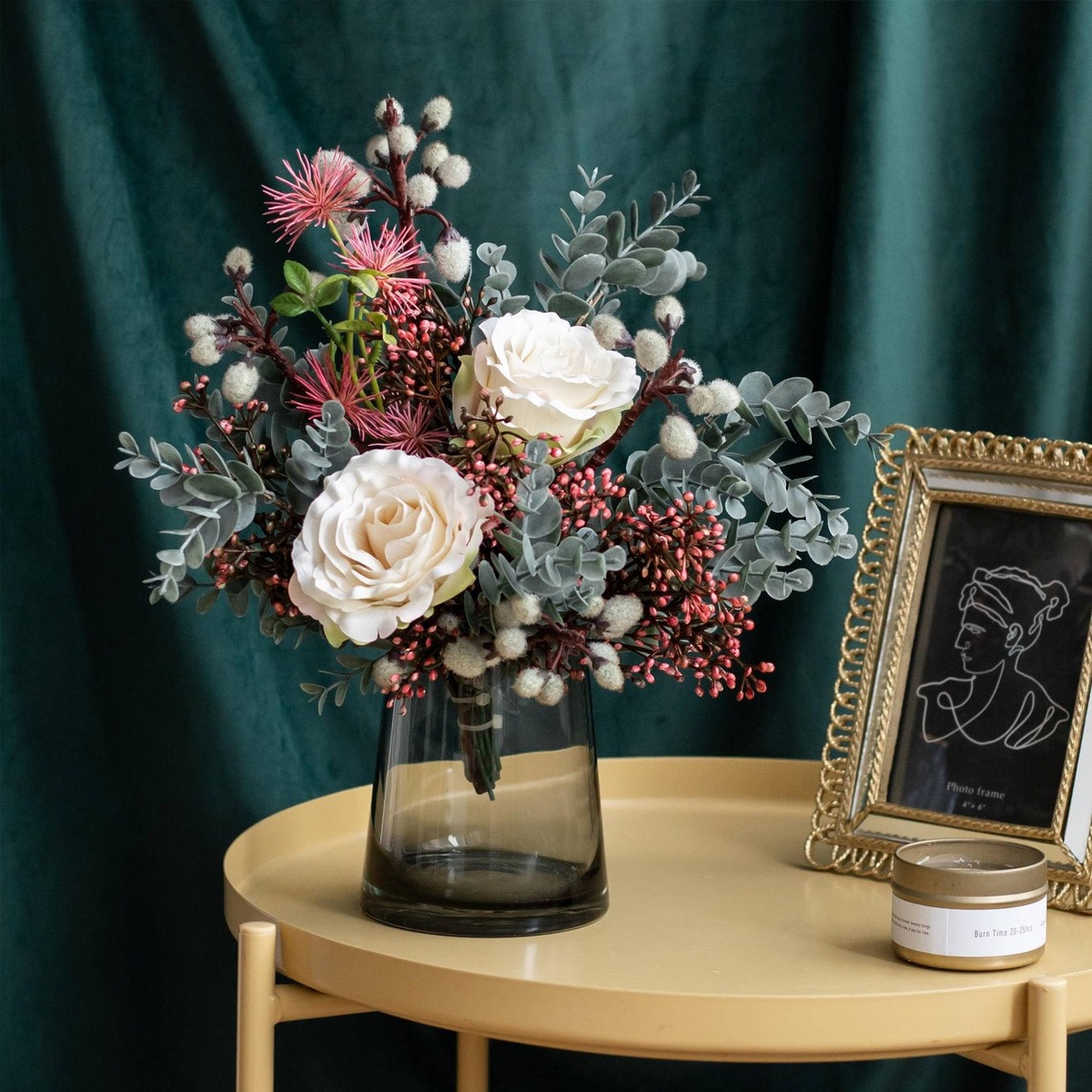 超爱这一组手捧花束,浓浓的法式风情,低调又不失浪漫,与背景的墨绿色相呼应。金色的边几提升了质感,小巧精致的蜡烛香氛使氛围愈加浓厚。
