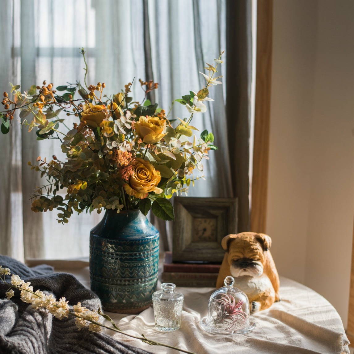 像是潋滟了秋季所有的颜色与美好,这样绚丽的花束辅以神秘蓝的碟翅花瓶,颜色搭配的特别和谐有爱,一款瞌睡狗狗,更是把这种舒适提升到极致,令人欢喜。