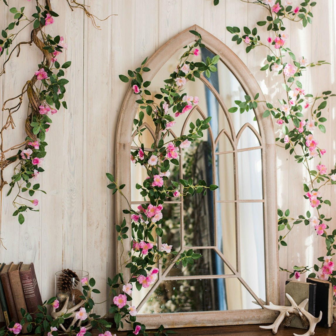 卧室梳妆台是否还是一场不变,除了化妆品,似乎没有其他用处,其实,你也可以尝试这样装扮,用充满生机的蔷薇花藤,打造出不一样的花世界,你也可以变美哦。