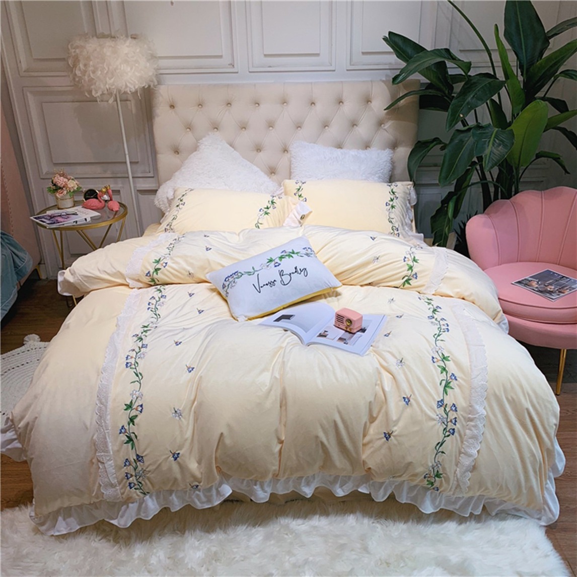 让人如痴如醉的田园风卧室,美出了天际。印花宝宝绒四件套,淡淡的黄色温暖整个冬天,床头茂盛的天堂鸟绿植,默默的净化着空气,洁白的羽毛落地灯,彰显淑女气质。