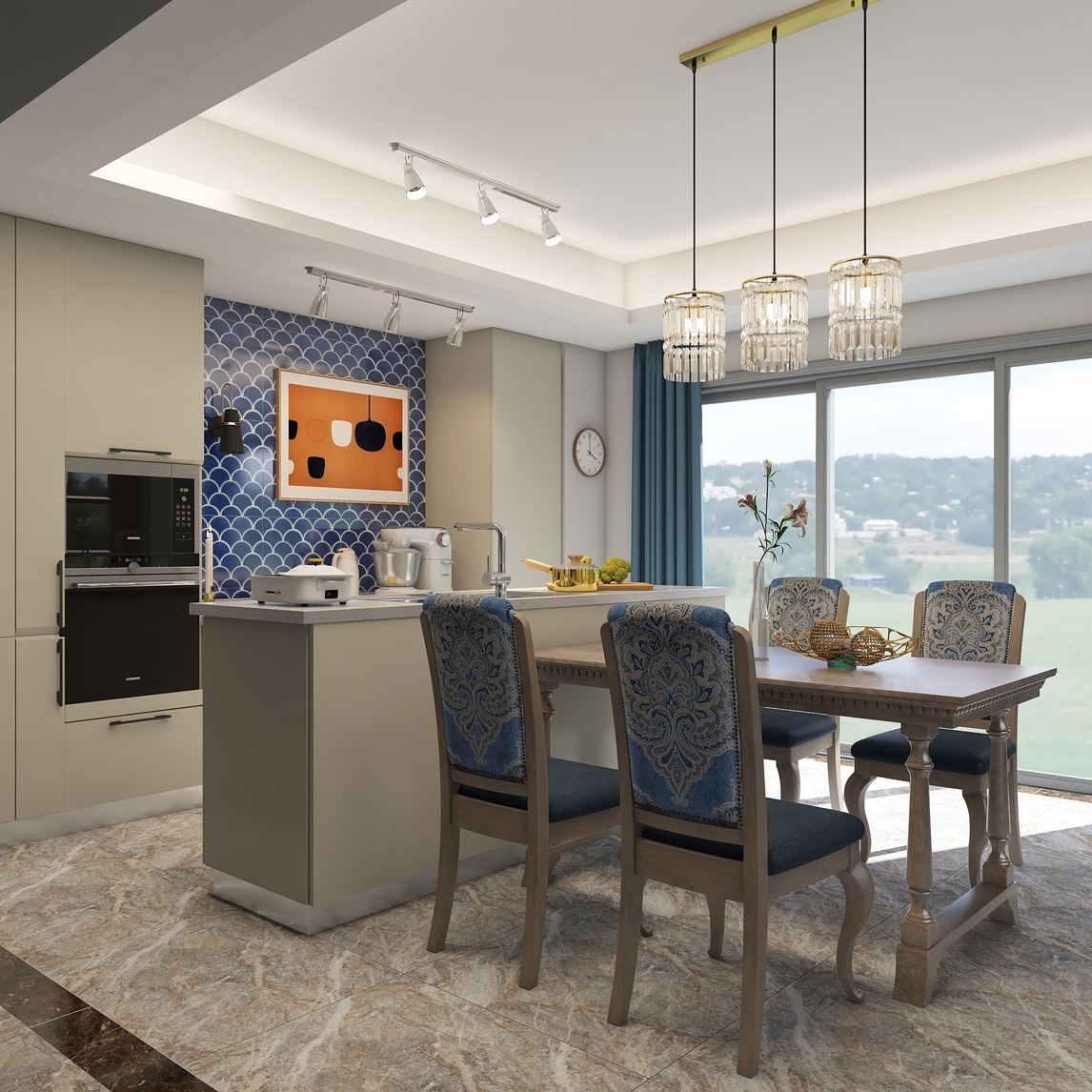一个有大落地窗的餐厅是很多人梦想中的场景,所以本案例中我们把西厨移到了采光非常好的餐厅中,设置了非常实用与美观兼具的中岛台,把餐桌椅和中岛台结合在一起,让每一餐都有明媚的好心情。