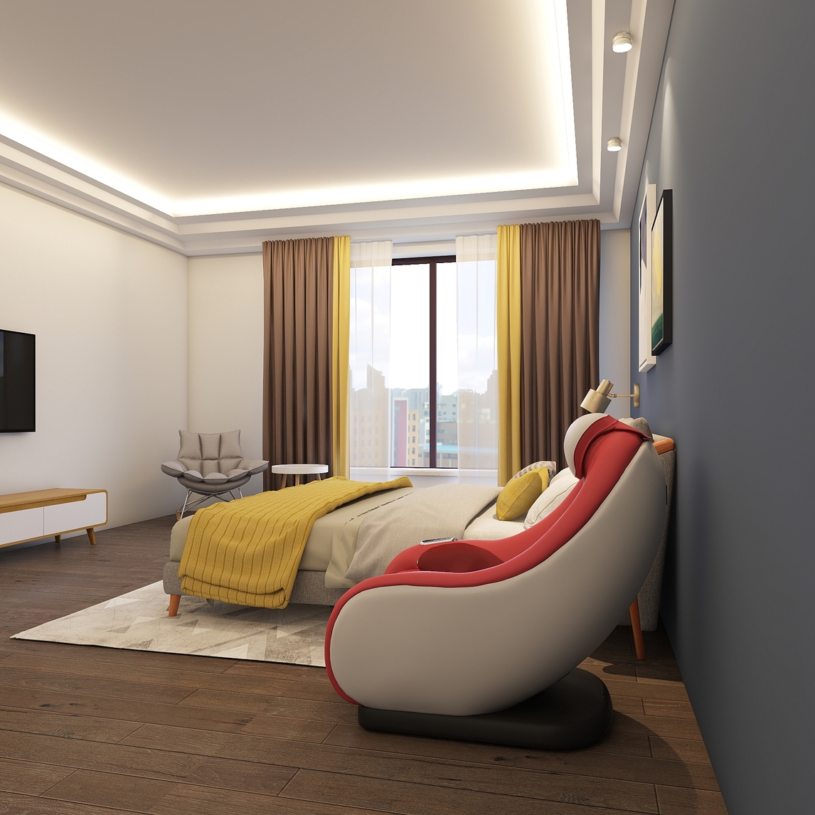 卧室不同于其他,对于卧室来说温馨、舒适显得格外重要,黄色调让房间整体看起来更暖,而搭配按摩椅更添了一份舒适感。