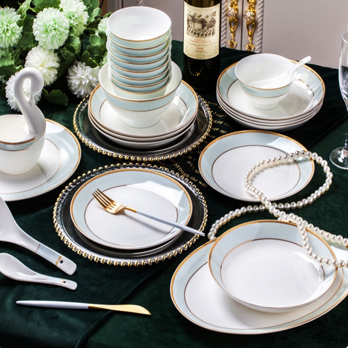 瓷器碗形成光洁的表面,易于清洗。经过洗涤之后,很难有污渍留下,细菌也很难附着。设计有金色边缘,有欧式感;瓷器套装,可以根据需要选择。