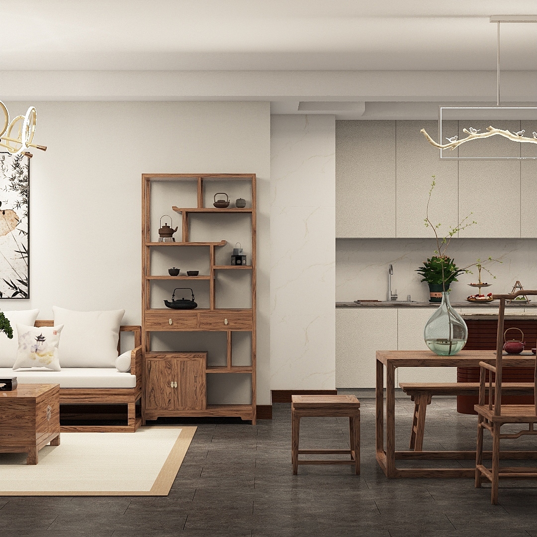 新中式的餐厅,不吃饭的时光更多是喝茶,一把小方凳,别致又雅趣。茶桌与客厅的博古架相得益彰,还可与家人亲密互动。