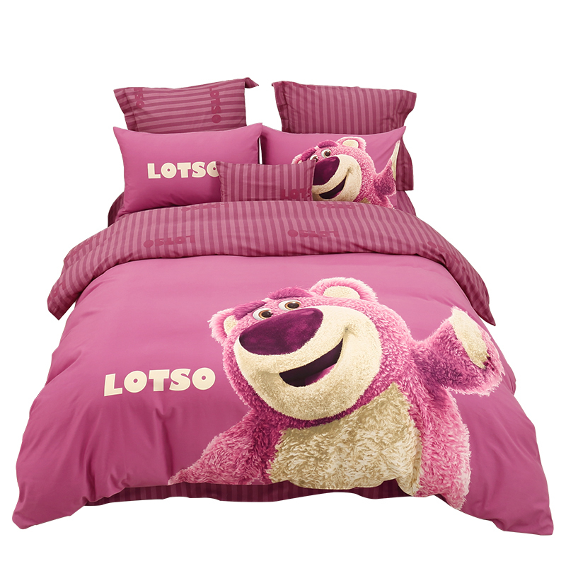 简约风设计儿童房床品四件套,阳光全棉材质制作面料,细腻柔软吸湿透气,磨毛工艺处理表面,浓密短绒毛御寒锁温一触集暖,萌萌哒草莓熊图案点缀表面,让孩子睡出童趣幸福感!
