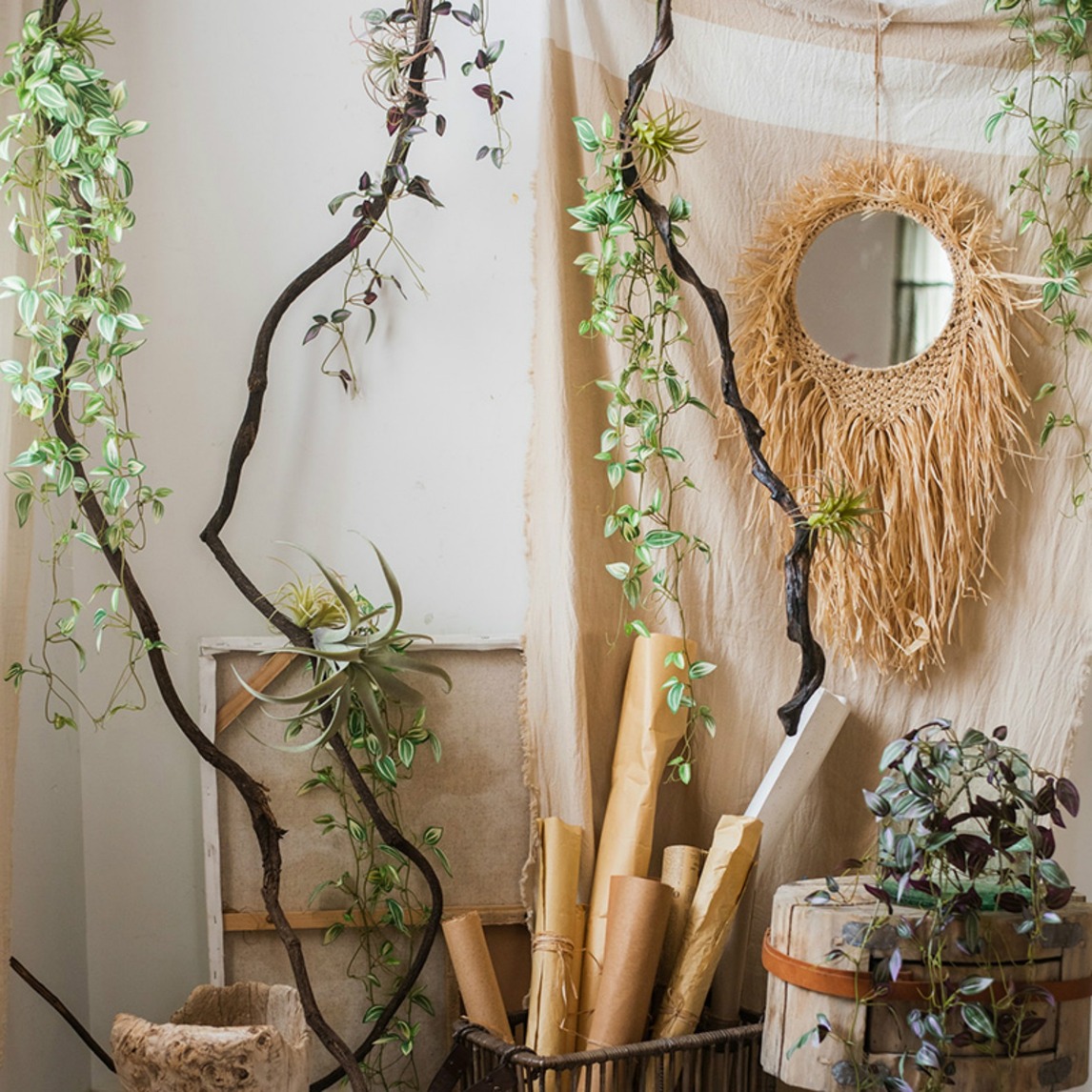 精选优质的垂吊绿植,小清新的气质特别吸引人,搭配仿真过江龙,把粗放与细腻完美演绎,倒也是一种情趣,搭配日常所用的书卷等,书香横溢的空间里,也有小清新的陪伴,真好。