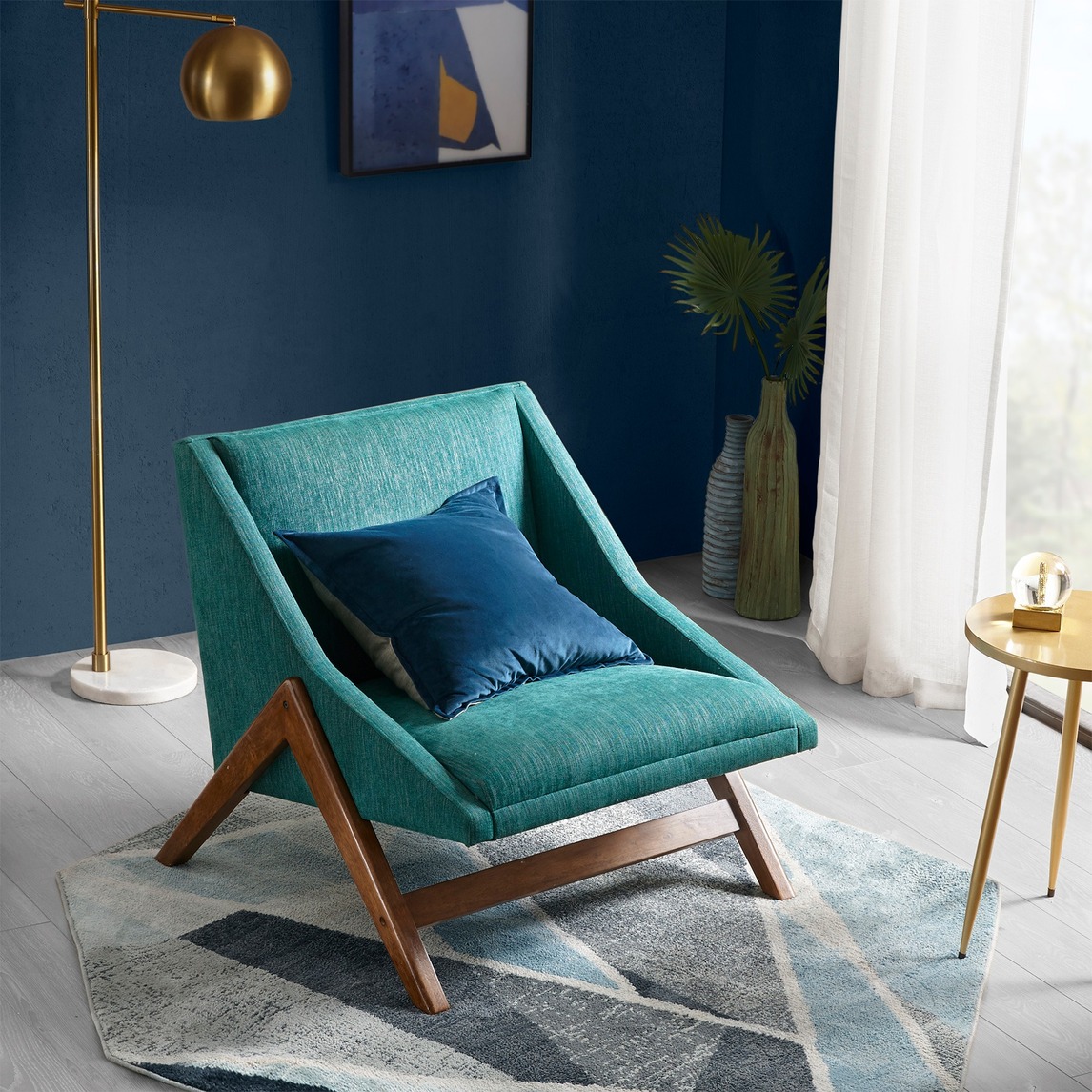 结合美术馆的色彩氛围,用蓝色打造了有仪式感和故事氛围的家居空间。神秘复古的孔雀绿休闲椅搭配绒感靠垫套,就像身处于中世纪阁楼。地毯的形状、几何印花与休闲椅腿相呼应,台灯与休闲桌的黄铜色元素营造出一个人的...展开