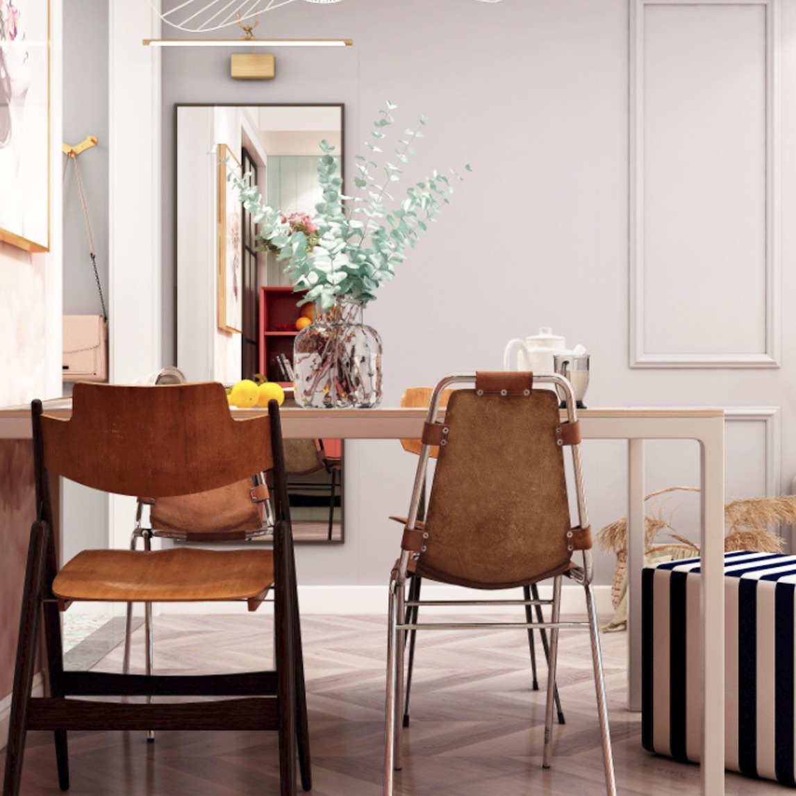 该空间大胆采用混搭轻奢风设计,做到尽可能不同,包括四个餐椅,各具特色,大墙镜子提高了空间的通透度。木地板V字形铺贴。