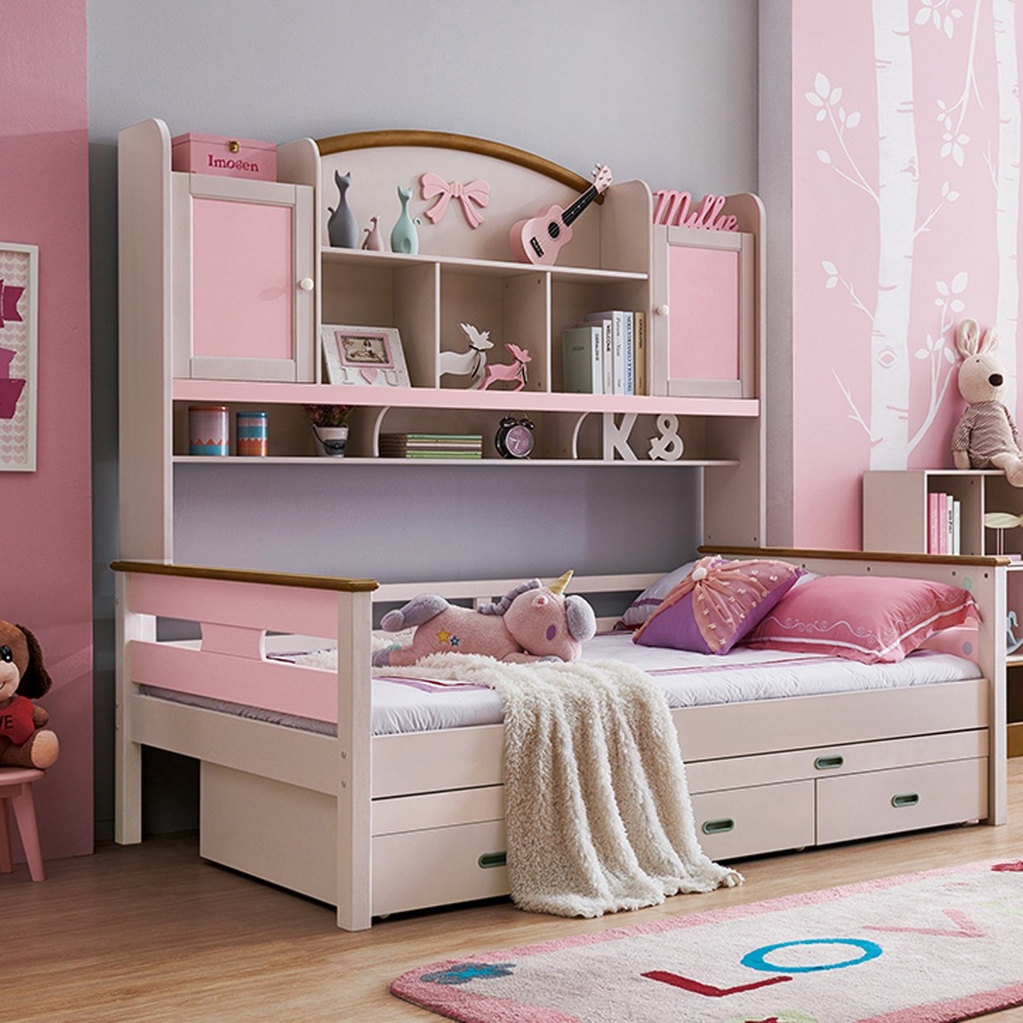 小户型黄金组合,为小户型节省40%的空间,一物多用,满足一般小孩子的储物需求。床上设计多个置物柜子,增加儿童床的功能,充分利用小空间,还培养孩子的物品归类能力。