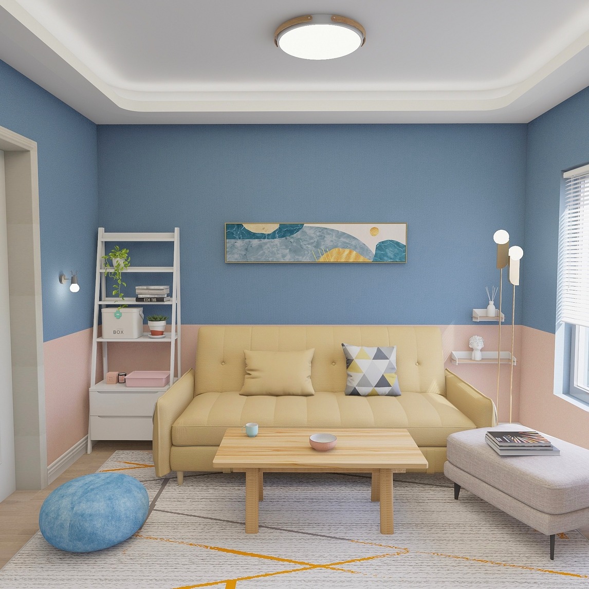 非常有创意的客厅会客空间,采用了活泼的色彩搭配,使得整个空间都充满活力,在灯具的选择上,采用了想配的吸顶灯,和同样有艺术活力的落地灯的搭配,让房间充满创造力。