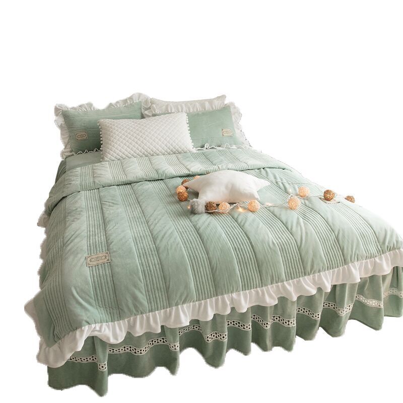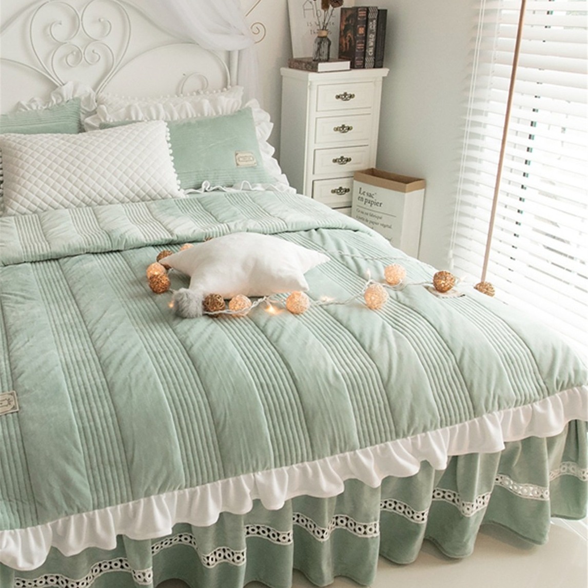 喜欢这种清新的北欧风设计,淡绿色的四件套清爽宜人,荷叶边的点缀显得格外可爱,特别适合小女生的房间布置。