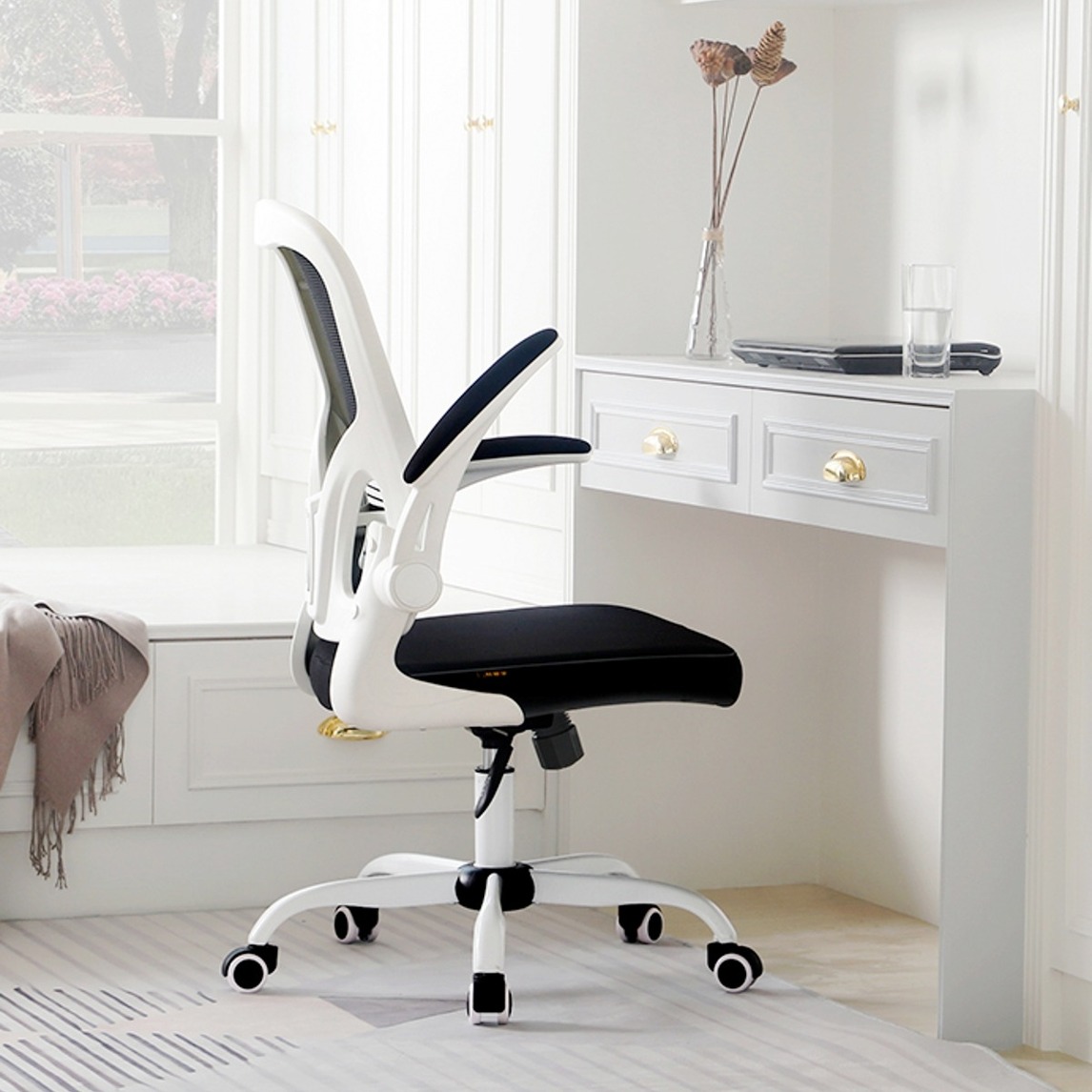 简约舒适的电脑转椅,扶手角度可自由调节,方便插入书桌下部,给你的居室减少使用面积,柔软的坐垫,网面的靠背设计,无论冬夏,都能给你最舒适的体验。