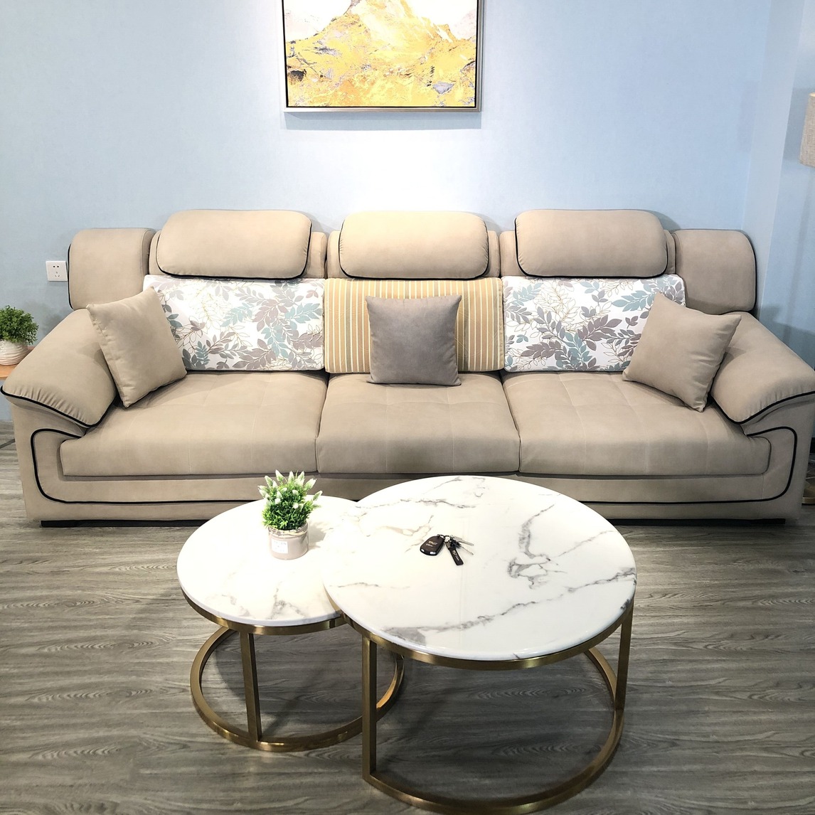 现代简约风的稳重搭配轻奢风的豪华,可以说是低调的奢华,是个不错的选择。沙发选用的是厚实饱满的德国科技布沙发,具有防水防污功能,免洗,茶几搭配的是大理石面,电镀金色脚的圆形茶几。
