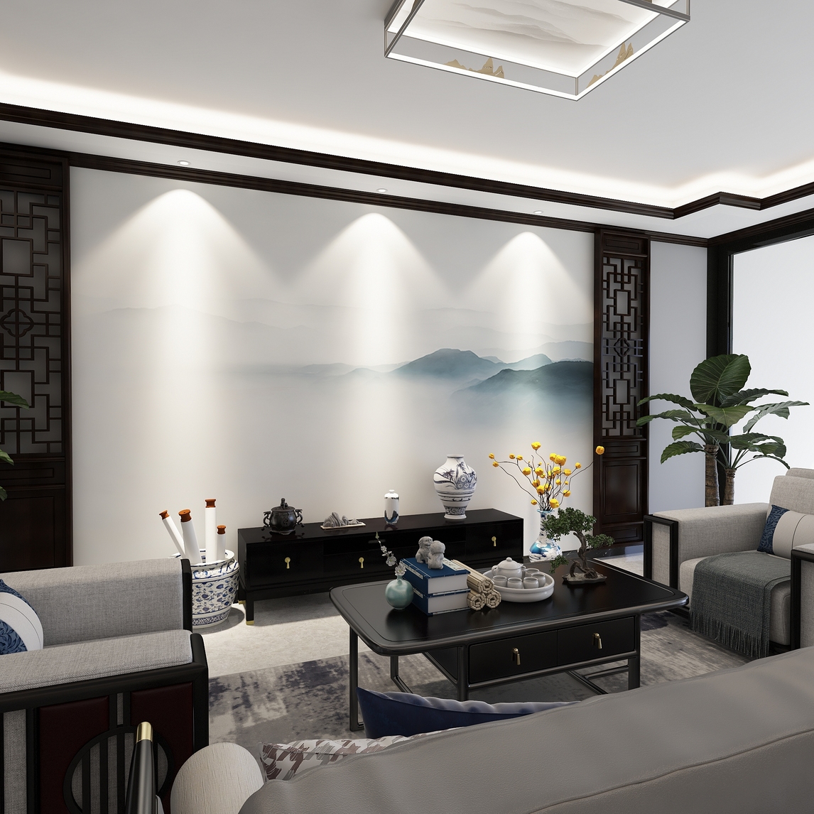 山在云中,云在山中,一副大气的背景墙壁画提升了整个家居的格调。 整体搭配以淡雅的色调为主,材质的选择体现出新中式的素净与沉稳。 装饰物与摆件零星的点缀和布局,精巧而细致,没有任何多余的陈设。 浓与淡、...展开