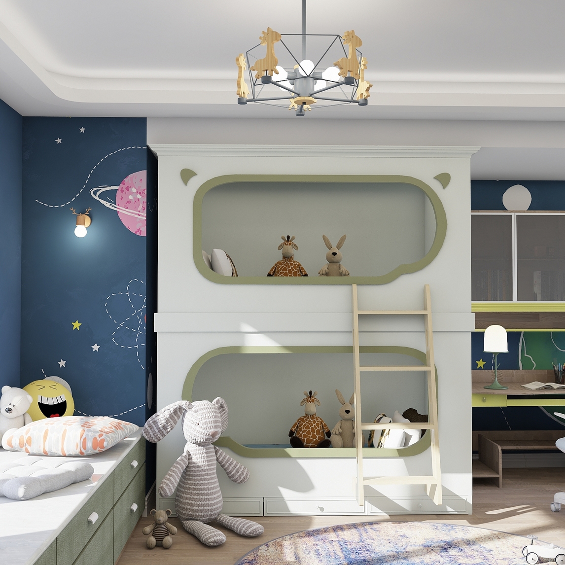 儿童卧室的设计,讲求将更多的趣味元素融入到设计中去,我们采用了卡通元素的吊灯,给整个卧室增添了光影的美感和童趣的美好,双层的儿童床提供了更好的睡眠和玩耍的空间,我们将窗台设置成了休闲的空间,配合壁灯给...展开