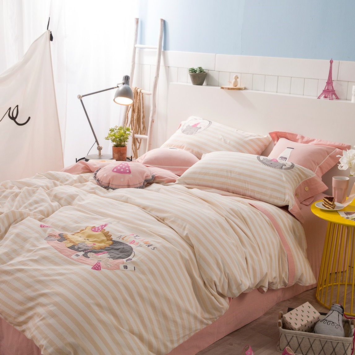 淡淡的粉色和纯洁的白色,这正是小女孩最爱的卧室,全棉条纹四件套,卡通动物印花萌翻全场,淡蓝色的墙壁,白色的窗纱,制造梦幻的感觉。