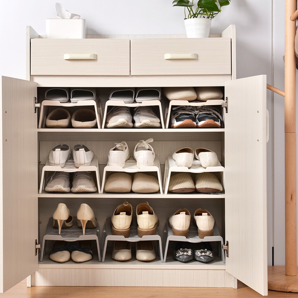 鞋子太多,空间不够,过于拥挤,用上这款双层鞋托架,鞋架上下层节省空间,高跟鞋也适用,可拉式凸起设计,.上 层鞋子可直接拿取穿着,下层也可方便拿取。