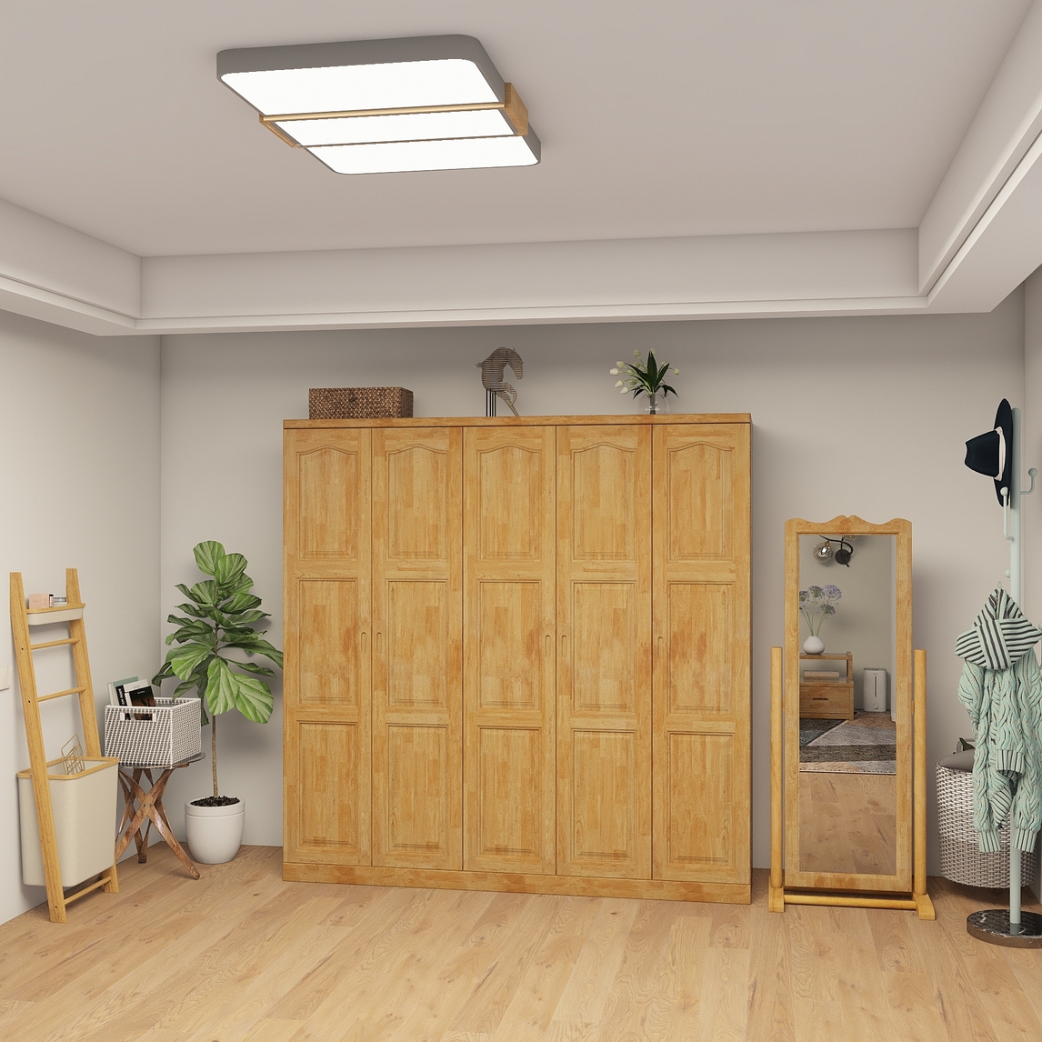 卧室中有一款大衣柜,可以让家变得更加地井然有序,原木色的衣柜贴墙而立不会占用太大空间,而且作为放置衣物的地方也是恰到好处的。配上几株绿植,添上些许装饰,一个温馨暖意十足的卧室搭配就出来啦!