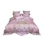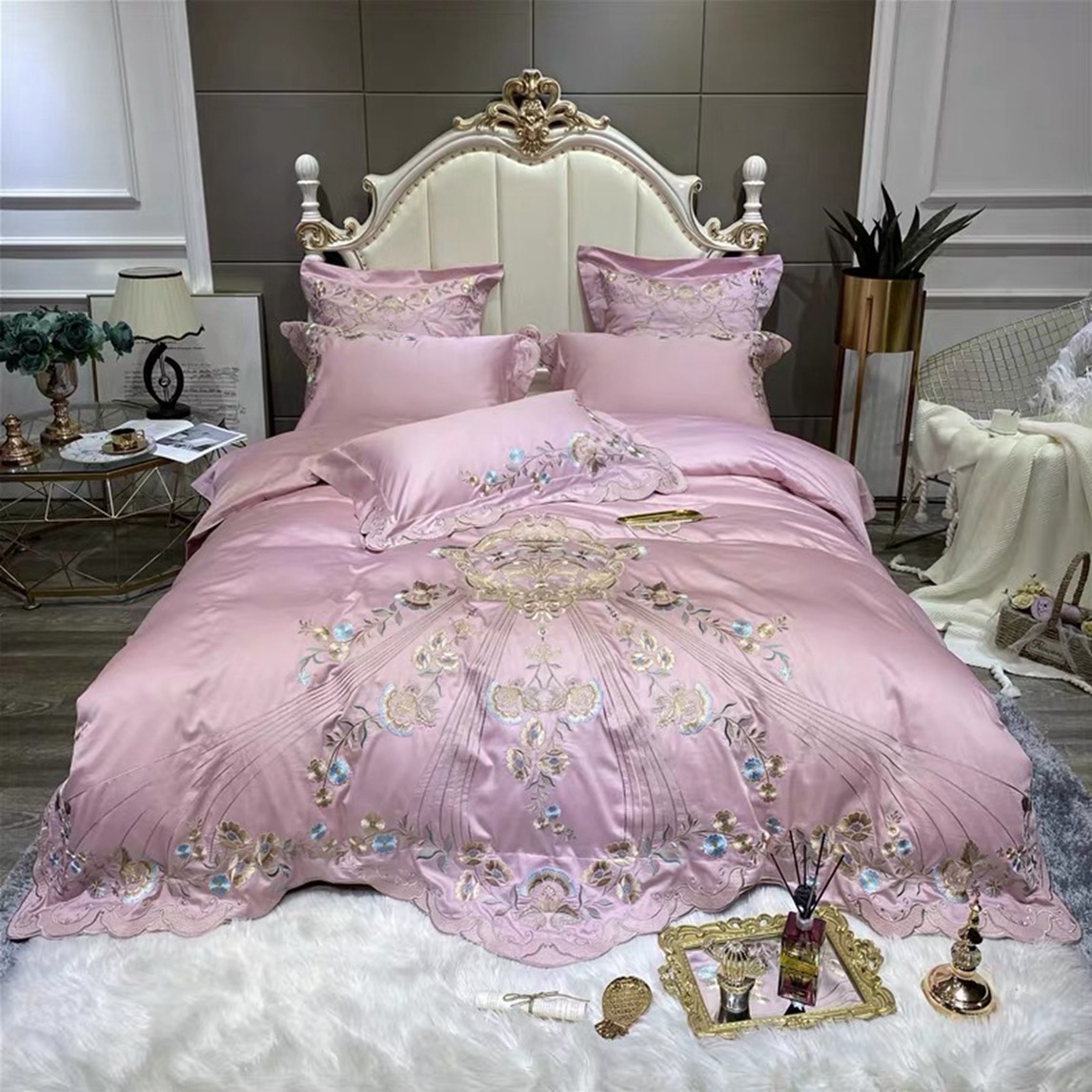 欧式风奢华60支长绒棉四件套,采用轻奢的金色刺绣点缀,搭配上温馨的粉色调设计,凸显出浪漫的公主风卧室。