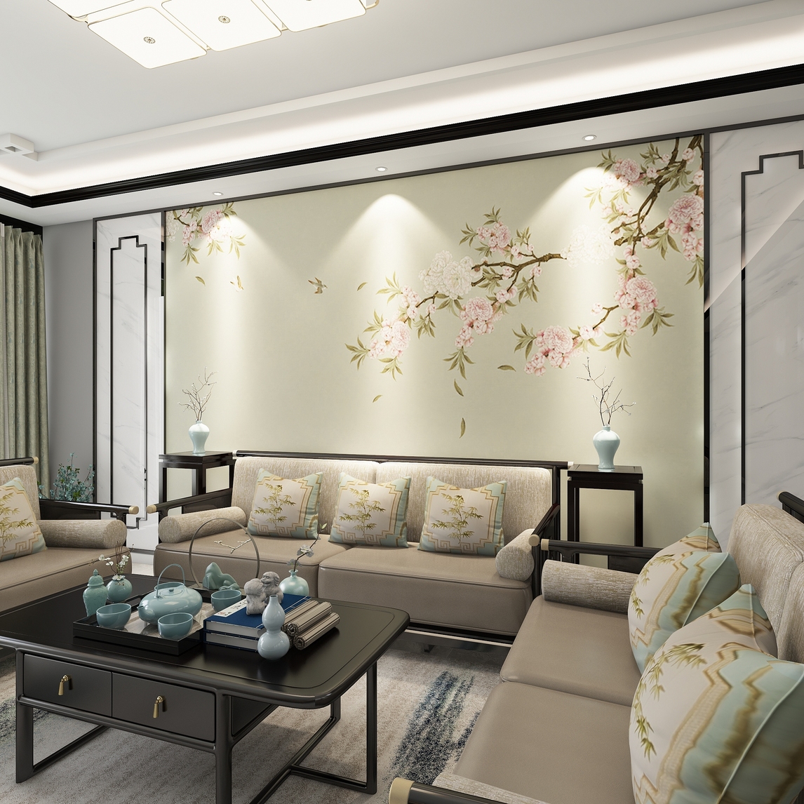 淡青绿色调的运用,携同水墨质感地毯、淡雅墨竹抱枕、棉麻枕面, 中和了深色调木质家具的厚重感,映照着满室清冽质朴、自然沁人的空间格调。 背景墙壁画上芙蓉盛开、喜鹊双飞,生动有趣,呈现春日欣欣向荣之景、为...展开