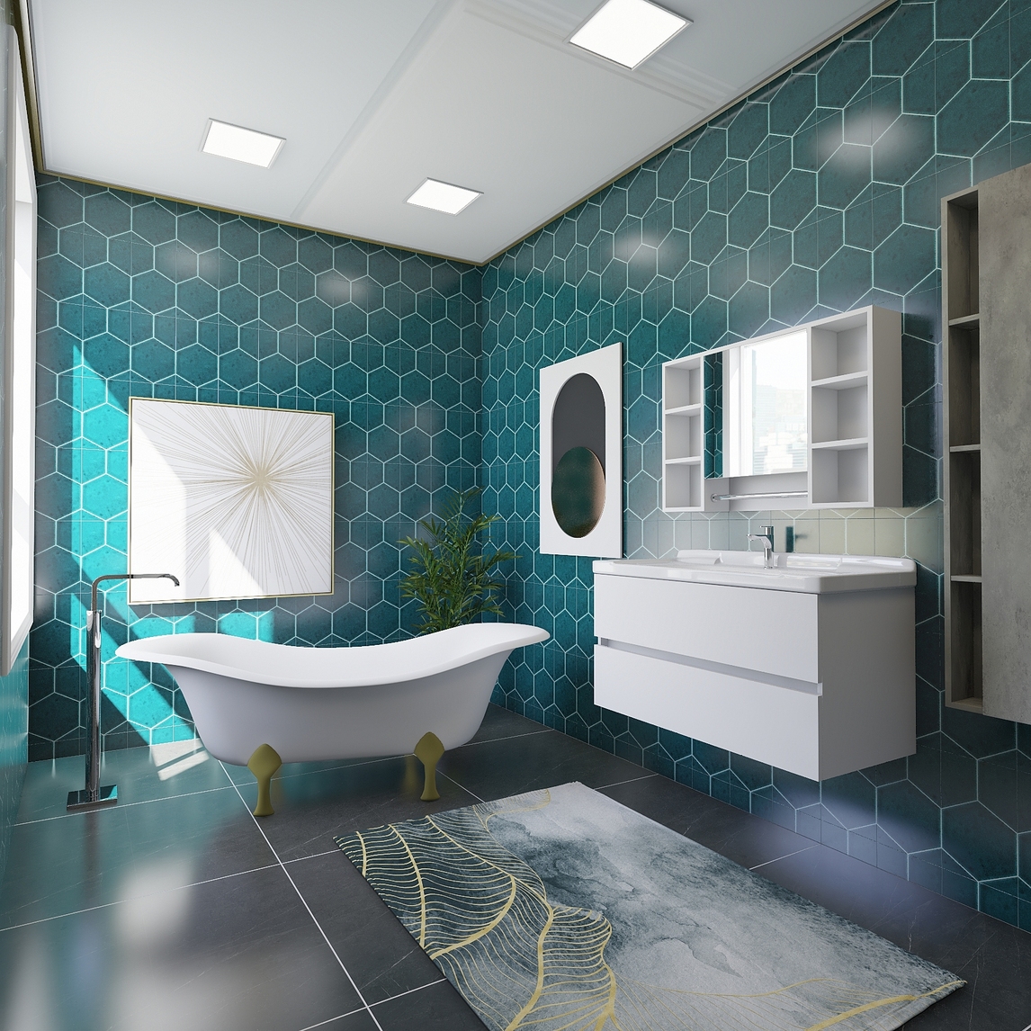 以大胆的颜色进行视觉冲击,在狭小的空间内做到内容化,配色大胆,但尽显奢华,将功能区洗漱去沐浴区做细致化分,让使用者体验到最舒服的感受。
