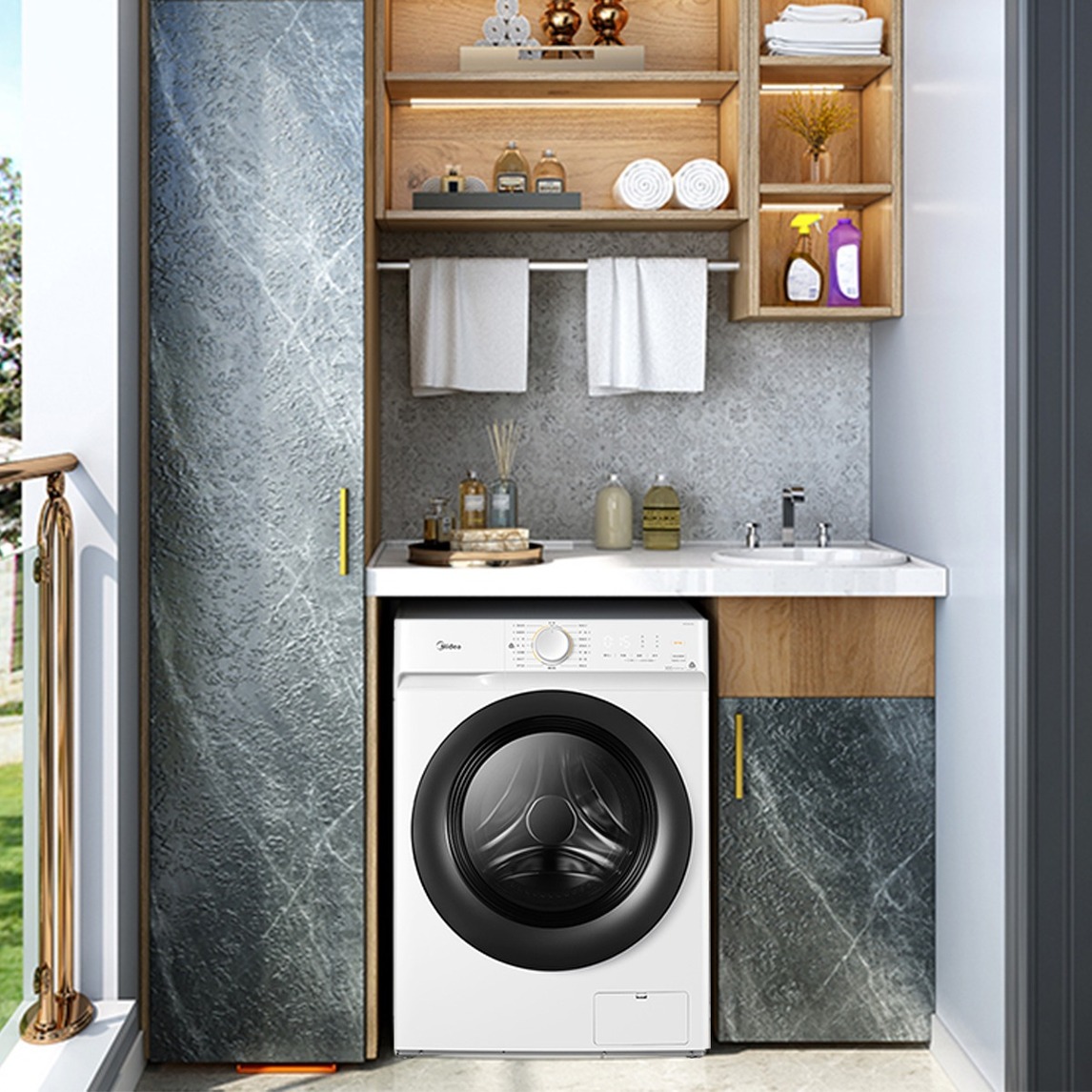 打破常规的线条规律,柜子表面的纹路风格,放荡不羁,凹凸不平的线条,又不失美感,背景的图案衬映,让这个阳台显得的更有个性化,木质的壁挂柜,将风格拉回了现实,整体风格更有立体的感觉,洗衣机的加入,可以让你...展开