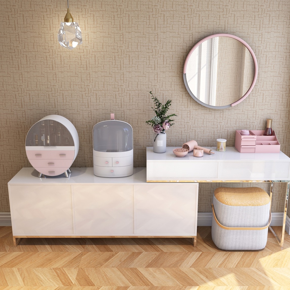 整体设计为轻奢风,电视柜结合梳妆台设计,美观使用。展示柜上摆放了精致的收纳盒,化妆品一一摆放在上面,不用担心化妆品太多,无处安放。