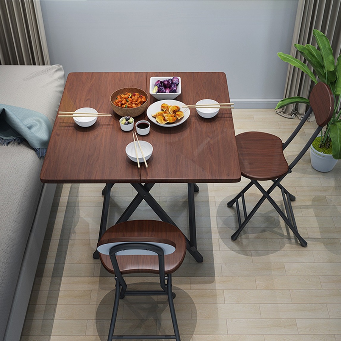 简易餐桌,光滑而又超薄的桌面,通过折页方式将两张桌面折叠在一起,构成一个正方形桌面,非常的轻便,供家人日常使用;重新放回在桌腿架子上,即可使用,非常方便。