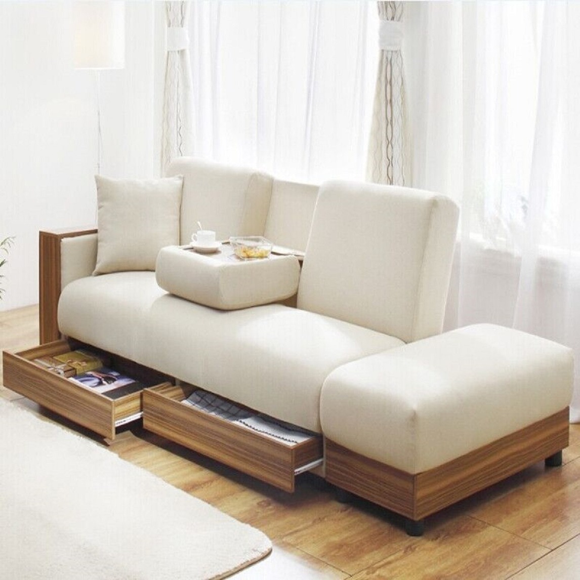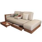 本次搭配选择的是多功能日式沙发,适合小户型客厅使用。它可以折叠,能当普通沙发坐,也能变成单人床。还有折叠茶几和抽屉设计,休闲收纳两不误。