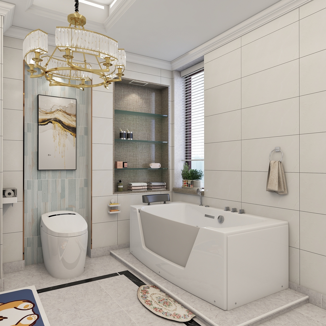 家居必备按摩浴缸,缓解疲劳更加实用,一点点的空间就可以享受浑身按摩,独有的一体坐便器更加干净卫生,低配优雅的吊灯和音箱,彻底解放疲惫!