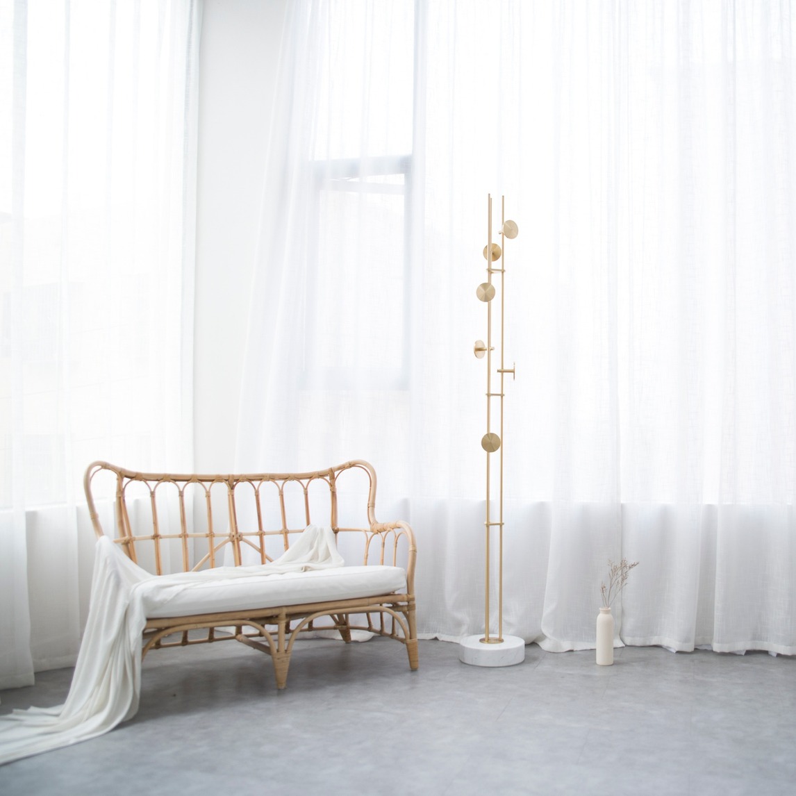 在客厅营造纯白空间,柔和的光线透入,带来清雅恬淡的意境,有仙气飘飘的感觉。白色窗纱、古典黄铜衣帽架、藤扶手沙发、米白花瓶,极简之中透着精致的气息。