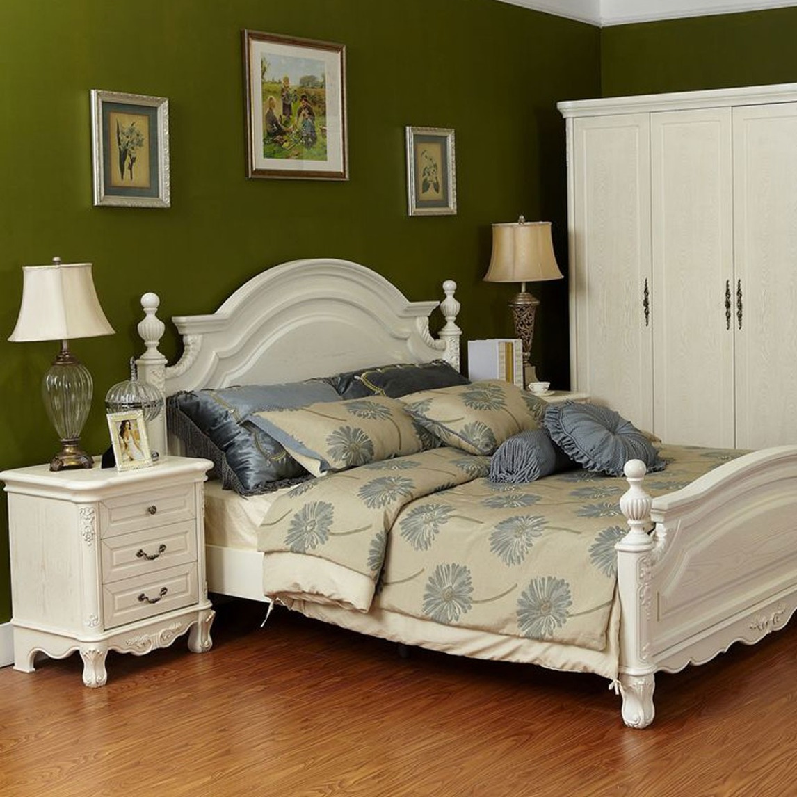 这款欧式精美的实木床拥有着美式雕花田园风格,低调奢华有内涵有木有!?墨绿色背景墙简约而又不失礼仪,墨绿色配上简约而又时尚的白色家具,简直靓到不要不要的!!