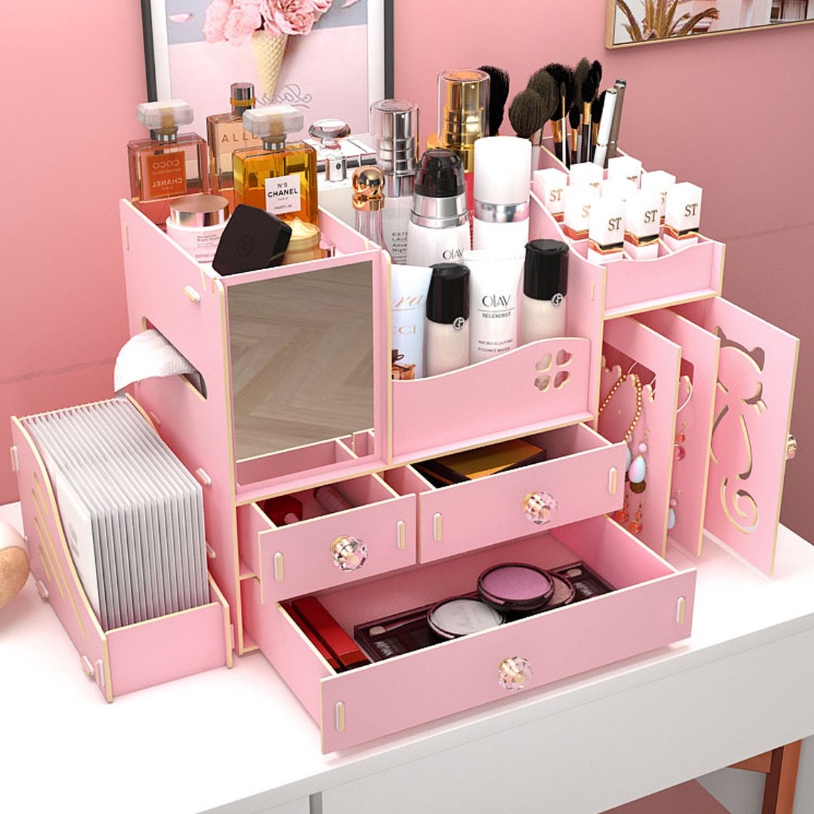 抽屉式化妆品收纳盒塑料桌面整理盒带镜子纸巾护肤品置物架;大气又美观,抽屉设计,防灰防尘又整洁,顶层无盖可以放置瓶瓶罐罐,解决化妆品香氛的存放问题。