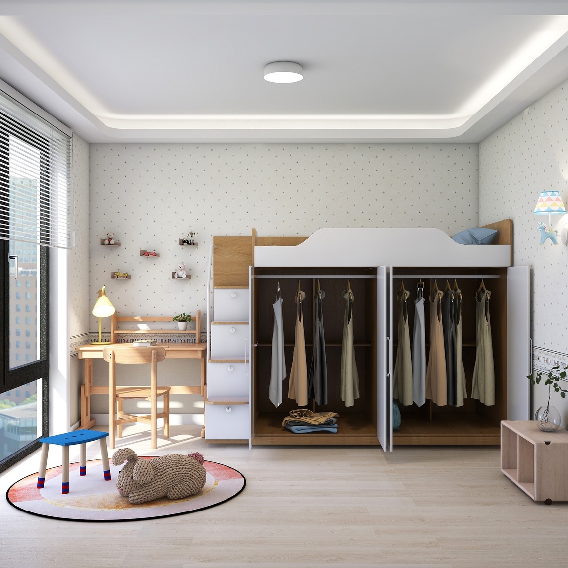 小户型儿童房的设计,要满足睡觉、学习、玩耍的功能,衣柜的收纳空间是最难处理的,所以我将衣柜的功能融入了高低床的设计理念,不仅美观实用、而且超级不占用空间,让小小的卧室多出一个衣帽间。