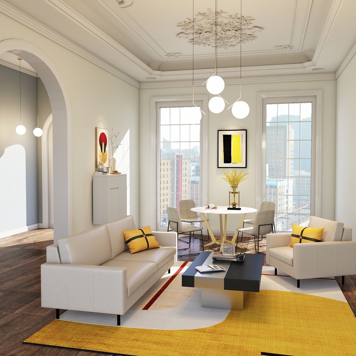 白色简洁的背景墙与田园风地毯和谐搭配,低台度大面窗揽入室外景观,为凸显舒朗阔卓的空间感,搭配几何方形西斯茶几,矮背式白色狄安娜沙发,高度降低,空间视觉感更显高挑。